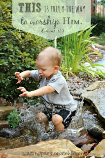 Then, I broke the “rules” and let him play in his sandbox after getting wet. His joy was contagious! I didn’t care about the muddy mess he made of his clothes; I didn’t chide him for his impulsivity. I just watched and cheered him on with each splash. As I witnessed him worshiping with his life, he inspired me to worship with mine. Every smile and every squeal made me more aware of God’s love. Yet in those sweet moments, I knew the amount of love and joy I felt for my own son paled in comparison to the joy God feels when I worship him with my whole being.