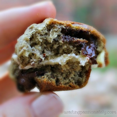 Pre-heat your oven to 350 and grease two mini-cupcake pans (I spray them with coconut oil). In a large mixing bowl, smash bananas and add wet ingredients. Stir in dry ingredients, except chocolate chips and almonds, then mix with a hand-held electric mixer. (Feel free to lick the beaters if you don’t so much care about raw eggs.) Add the chocolate chips and almonds last, and stir those in by hand. The batter itself isn’t incredibly sweet (which fit my desires perfectly since I’m breaking up with sugar), but the chocolate chips make up for that. Add more honey if you want a sweeter treat.