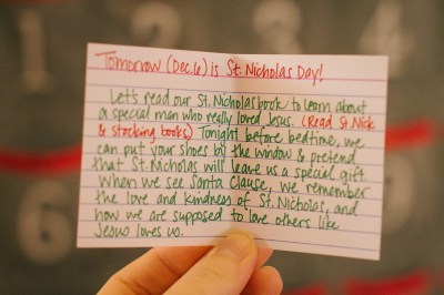 Instead of building up a belief in Santa, we tell the story of the real Saint Nicholas. Even at three years old, Asher understands that every Santa Claus we see reminds us of the real Nicholas, and how he served others because of his love for Jesus. I want my boys to be rooted in the things of Christ from an early age, but that doesn’t necessarily mean we’re Santa-haters…it also doesn’t mean we tell them that he comes down the chimney to bring presents. We celebrate Saint Nicholas day by reading a book about the real person, then we playfully sneak around and leave coins in each other’s shoes. This year, Asher insisted on sneaking the coins into his own shoes — fine with me! He really enjoyed himself and fully comprehended the concept.