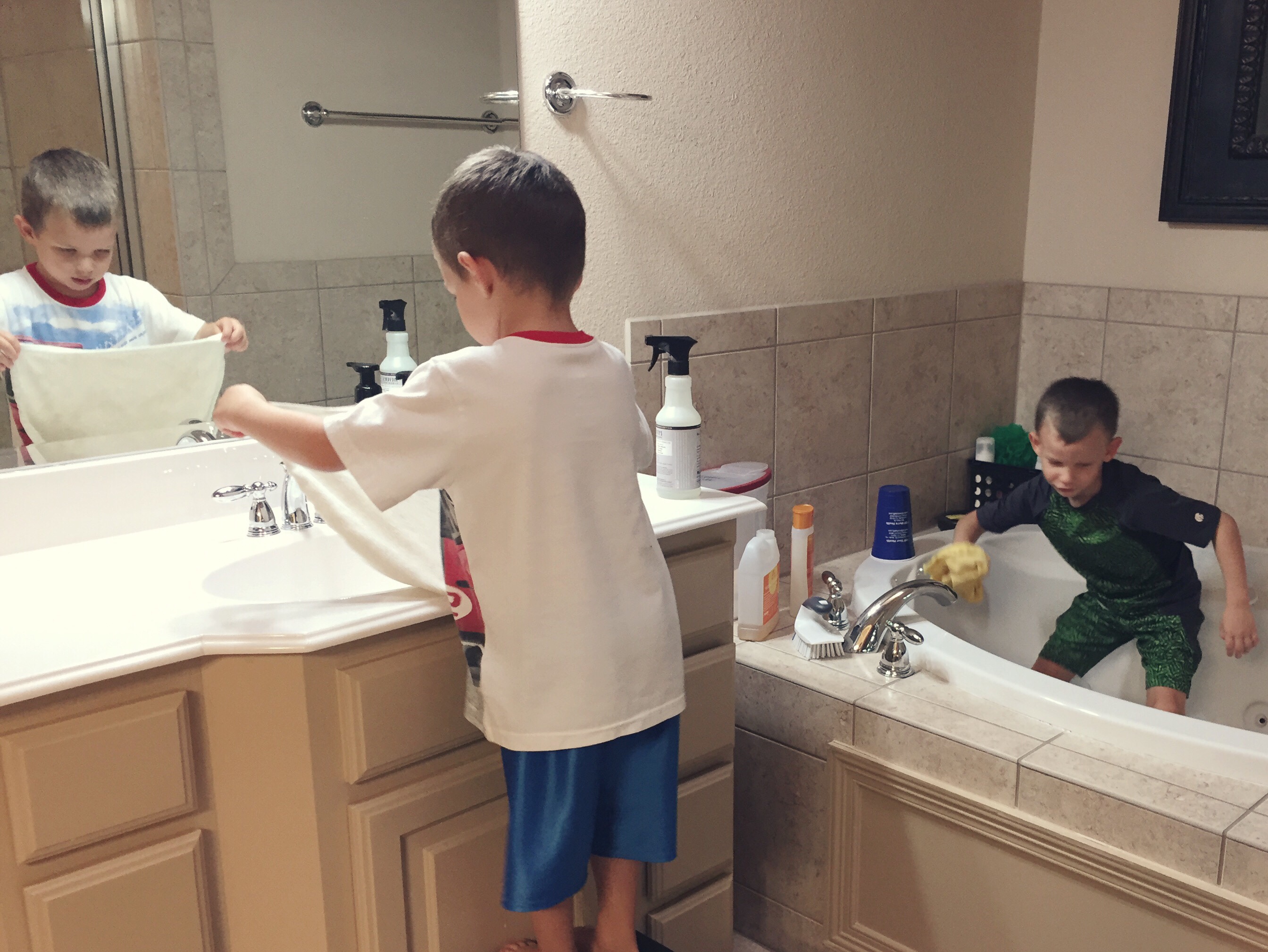 - Each morning, after finishing the laundry and dishes, run a toilet brush around each toilet bowl. Definitely clean all of them weekly, but you can keep toilets looking clean by swirling a brush around the bowl after the first morning flush of the day. I keep toilet brushes next to each toilet in my house, so it takes minimal effort on my part. In the afternoons after you’ve fired up the Instant Pot, have your kids (even the toddlers) help you with a Home Blessing. Turn on fun, upbeat music and set a timer for fifteen minutes. Tidy up the main areas of your house before dinner–clean off countertops, wipe down the table, put away toys. You don’t need to worry about laundry or dishes, because those were done hours ago! This method doesn’t deep clean your house, but it keeps your home presentable for unexpected guests, and it’s ready for a deep cleaning whenever you actually get the time.